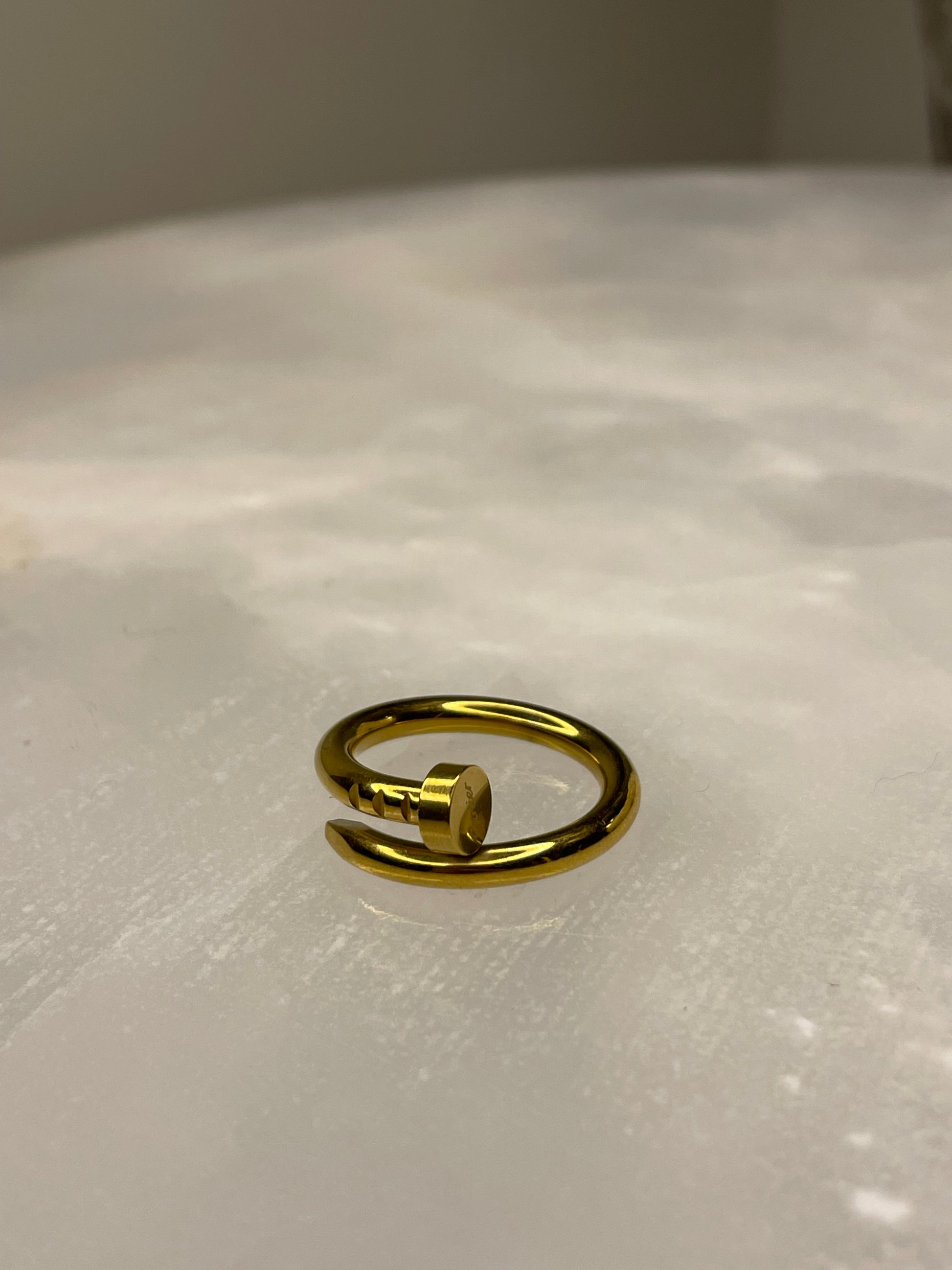 Sleek, bold, and effortlessly modern, this nail ring is designed to sit at the top of your finger for a fashion-forward look. Crafted with a smooth gold finish, it adds instant edge to any outfit while staying lightweight and comfortable. Finished with an anti-tarnish coating, this nail ring is made for everyday wear and easy styling.